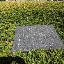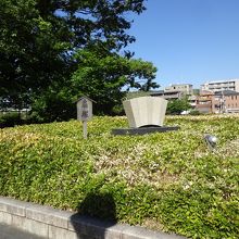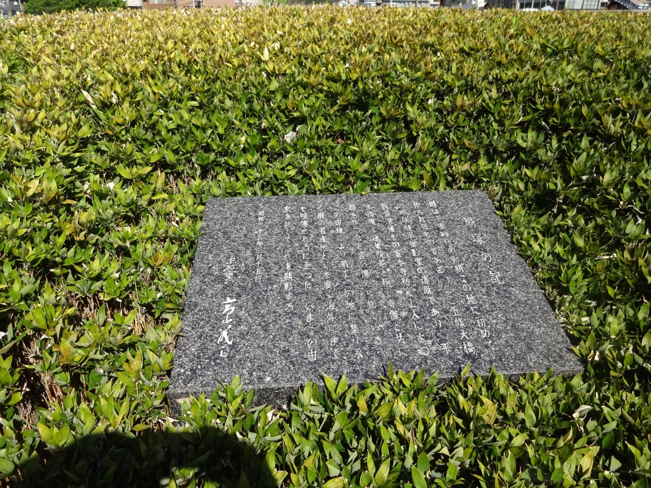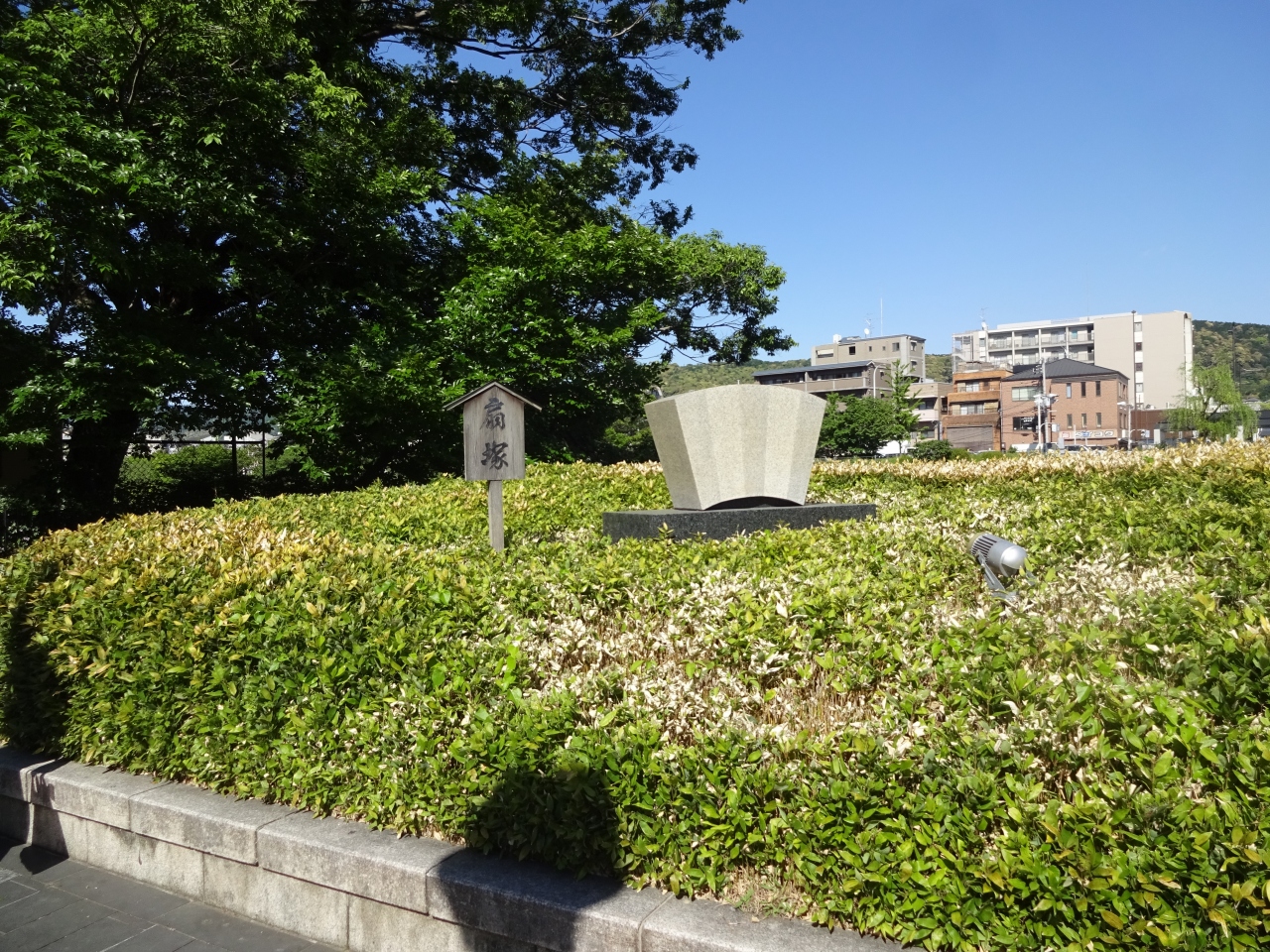 背の低い木の植え込み中に扇形をした石碑とその謂われを書いたものがあり、この場所が扇の発祥に関わる場所だと書かれていました。