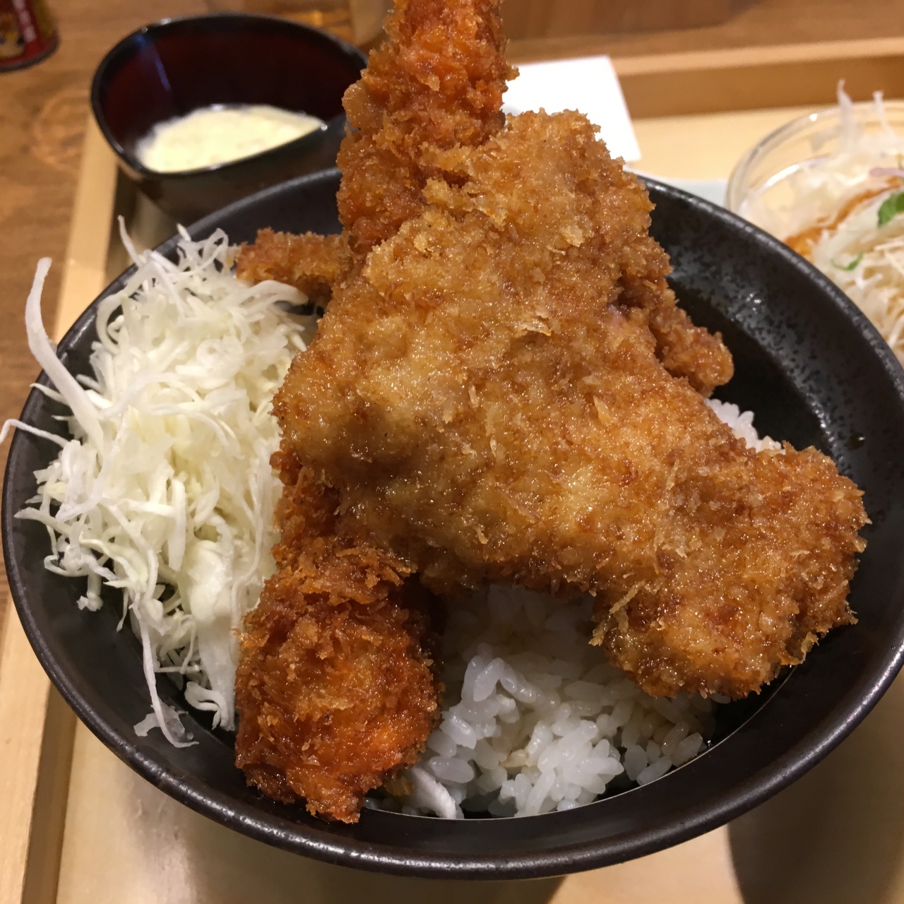 ジューシーというよりも肉肉しい感じのカツ、程よい濃さのタレがしみて美味しい。お好みでエビフライ用にタルタルソースをつけてもらえます。
