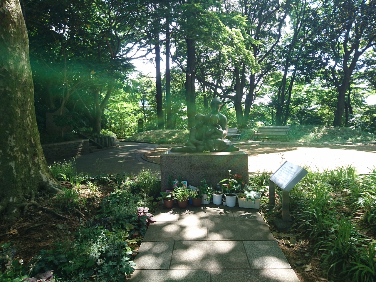 愛の母子象は、港の見える丘公園のフランス山地区の上の方の森の花壇の中心にあります。
