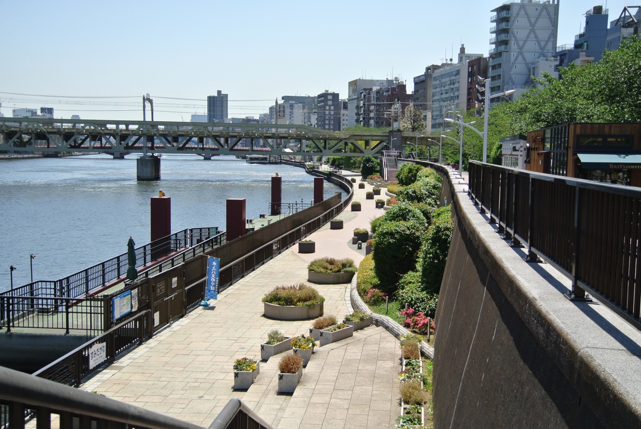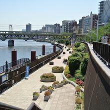 台東区側の公園は川沿いに長く延びた公園で、川越しにスカイツリーを望むことができます。カフェなどもありますが、平日で暑い日だったこともあるのか、それほど観光客はいなかったので、のんびりと過ごすできました。