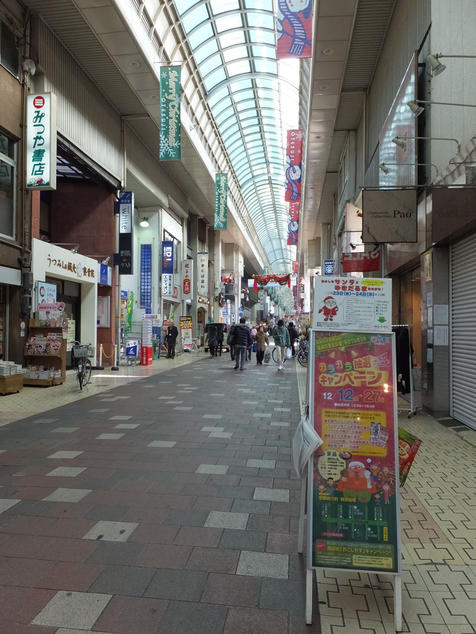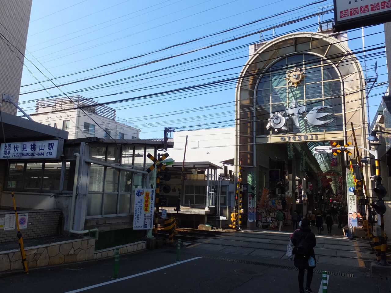 京阪伏見桃山駅のすぐ脇から始まるアーケードの商店街。入口の意匠もヨーロッパの駅を感じさせる高い半円形のガラスできれい。商店街の幅もやや狭く人通りも多いので活気が感じられました。