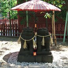 浅草神社境内の一番南側に鎮座していて、二体別々の石に彫られています。ふたつとも正面を向いていて、和傘をさしているところがなんかかわいいですね。現在は、良縁、夫婦和合、恋愛成就の願いを込めて、狛犬自体が祀られています。