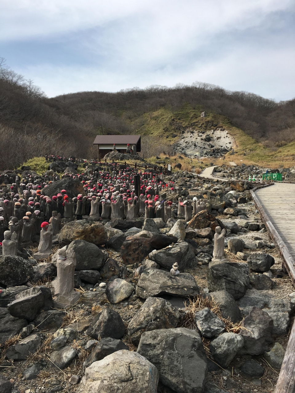 すぐ近くにある鹿の湯に入った後に、偶然見つけて立ち寄りました。道路に面した駐車場に車を止めて、殺生岩までは整備された遊歩道を歩いていきます。岩自体は急斜面にあるのですが、いまいちわかりづらかったです。近くに寄るよりも少し離れた場所にある展望台からの方が見やすかったです。周囲は硫黄の香りがたちこめ、草木も少なく異様な雰囲気で、それはそれで楽しめました。