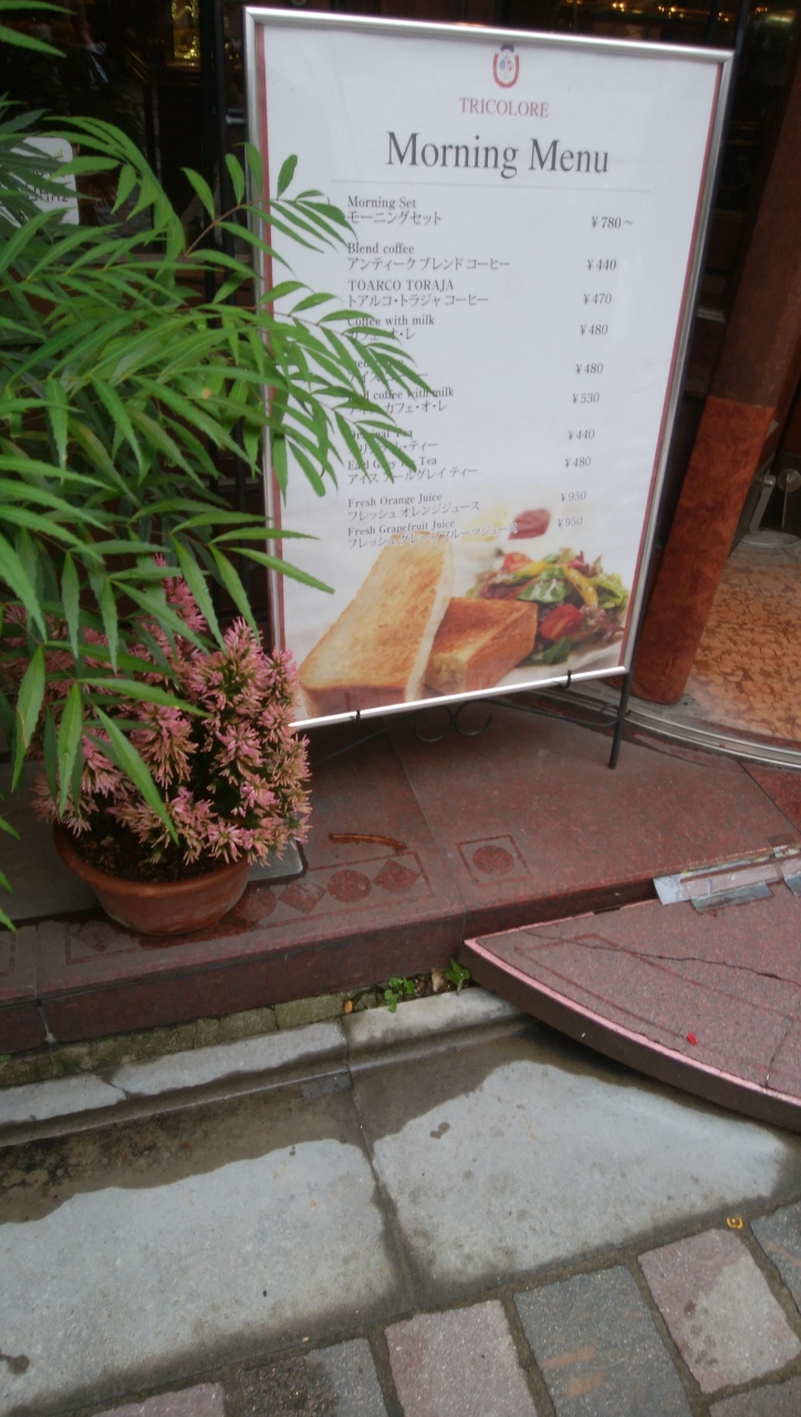 平日の朝に伺いました。一本奥まった場所にありますが、クラシカルなムードが漂う外観で赤いシェードというのかそれがめだちます。あとちょっと植物がうわっています。朝は780円で珈琲がつくモーニングセットをやっています。銀座の価格にすると、土地代を考えるとリーズナブルだと思います。朝はモーニングの看板になっているのですぐわかります。