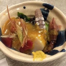 わかめの上に、マグロ、ホタテ、シャコにほたるいか、ミョウガが添えられて