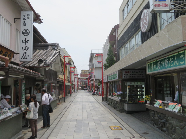 有名な草団子のお店、手焼きせんべいのお店や食事処が中心の商店街、平日でも参拝者が結構いますので商店街を歩く人もそれなりにいます。