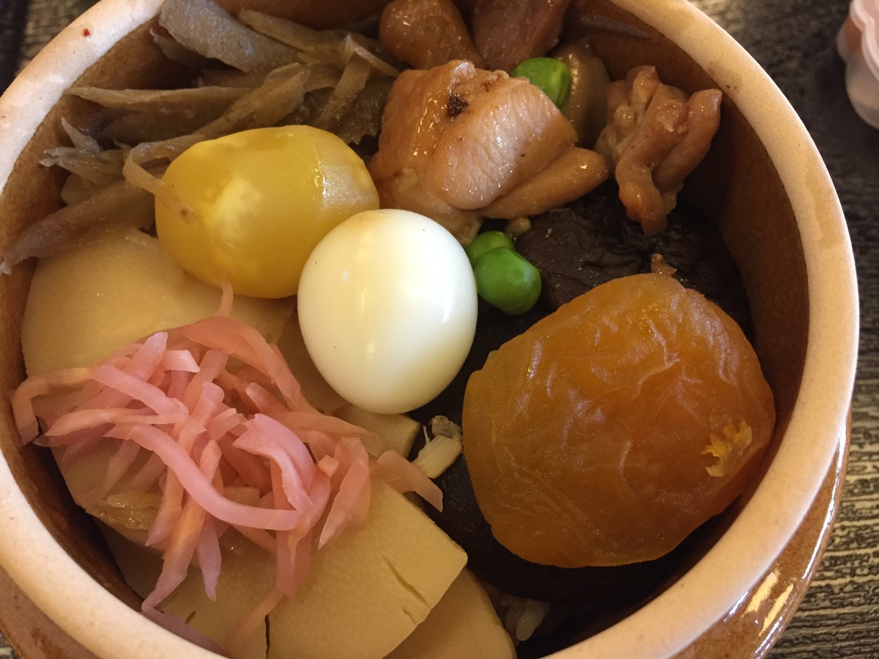 富岡製糸場のすぐ近くにある 釜飯で有名なおぎのやさんへ。入ってすぐのカウンターで注文して、代金を払い 、釜飯を受け取り 隣にあるイートインのスペースで頂きます。お水と、暖かいお茶がポットに置いてあり、紙コップで自由に飲めます。釜飯は熱々ではないですが、具がたっぷり入っていて美味しいです。可愛いプラスチックケースに入ったお漬物などもついて来ます。食べた後の器も持って帰れますよ。