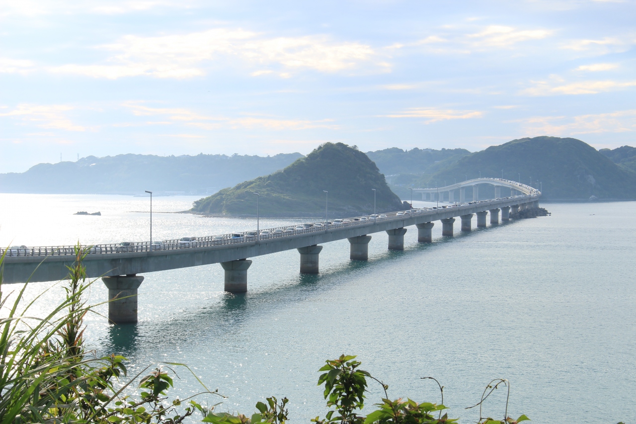 角島大橋まで行きました。島にわたる手前の駐車場にとめて写真をとりました。橋自体は島から戻ってくる車で大渋滞でした。夕方の時間帯だったのと、当日は少し曇っていたので、あまりクリアな写真をとることはできませんでした。 快晴の昼間に行くのがよいと思います。