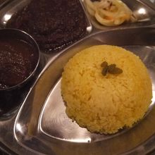 アルミ製の皿に、カレー2種、サフランライス、そして野菜の浅漬けが盛られている。