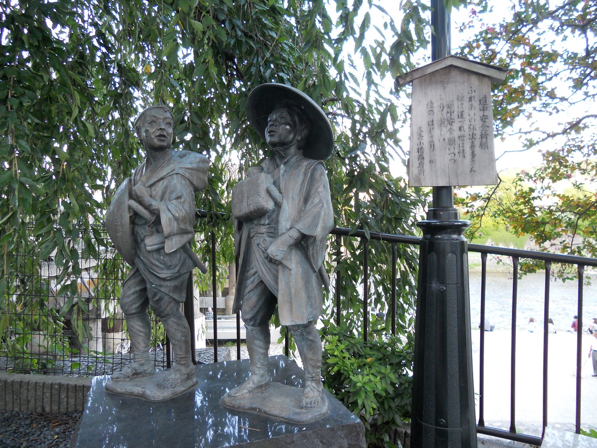 「弥次喜多像」は、鴨川に架かる「三条大橋」のたもとに並んで立っている像です。