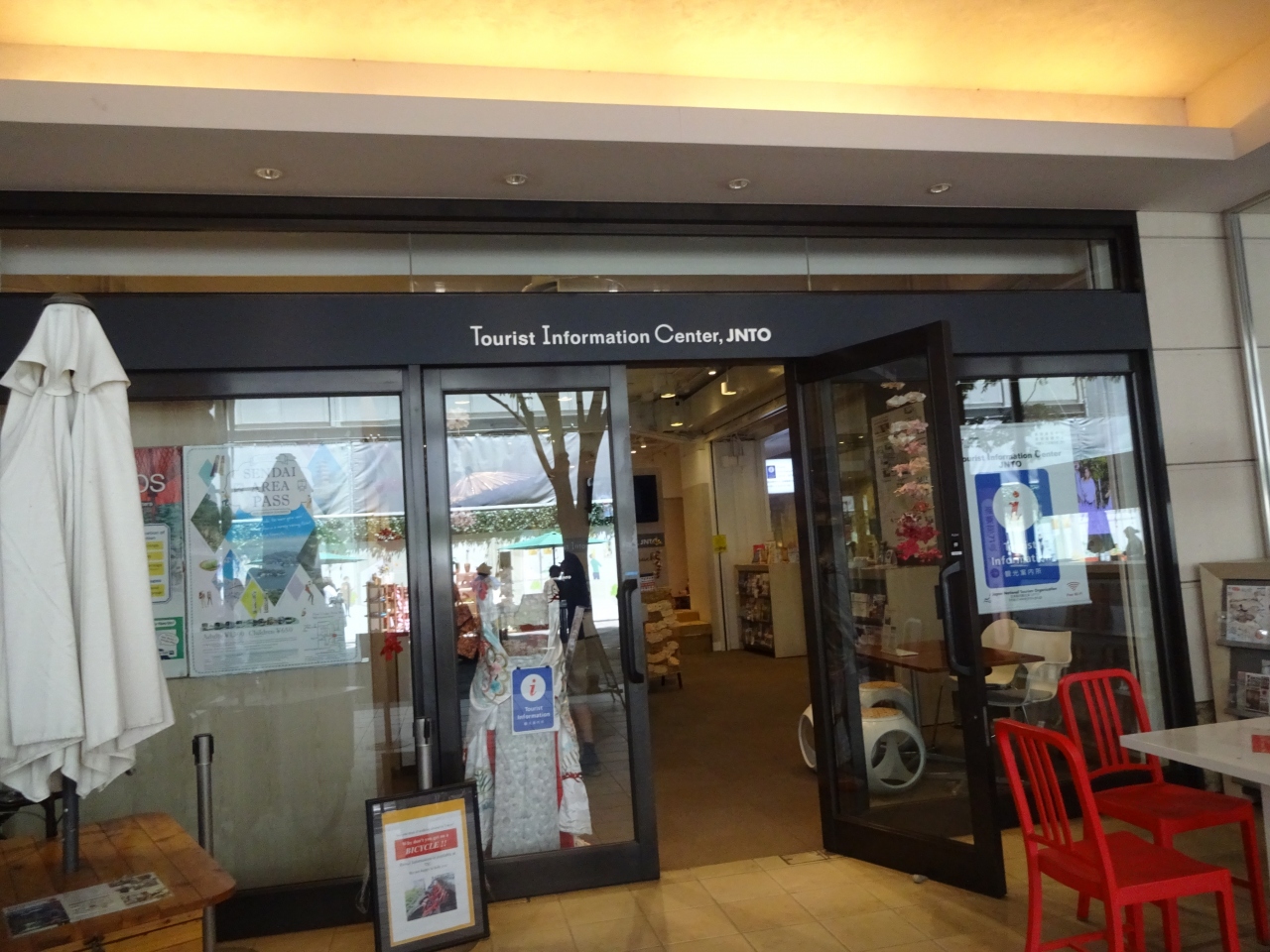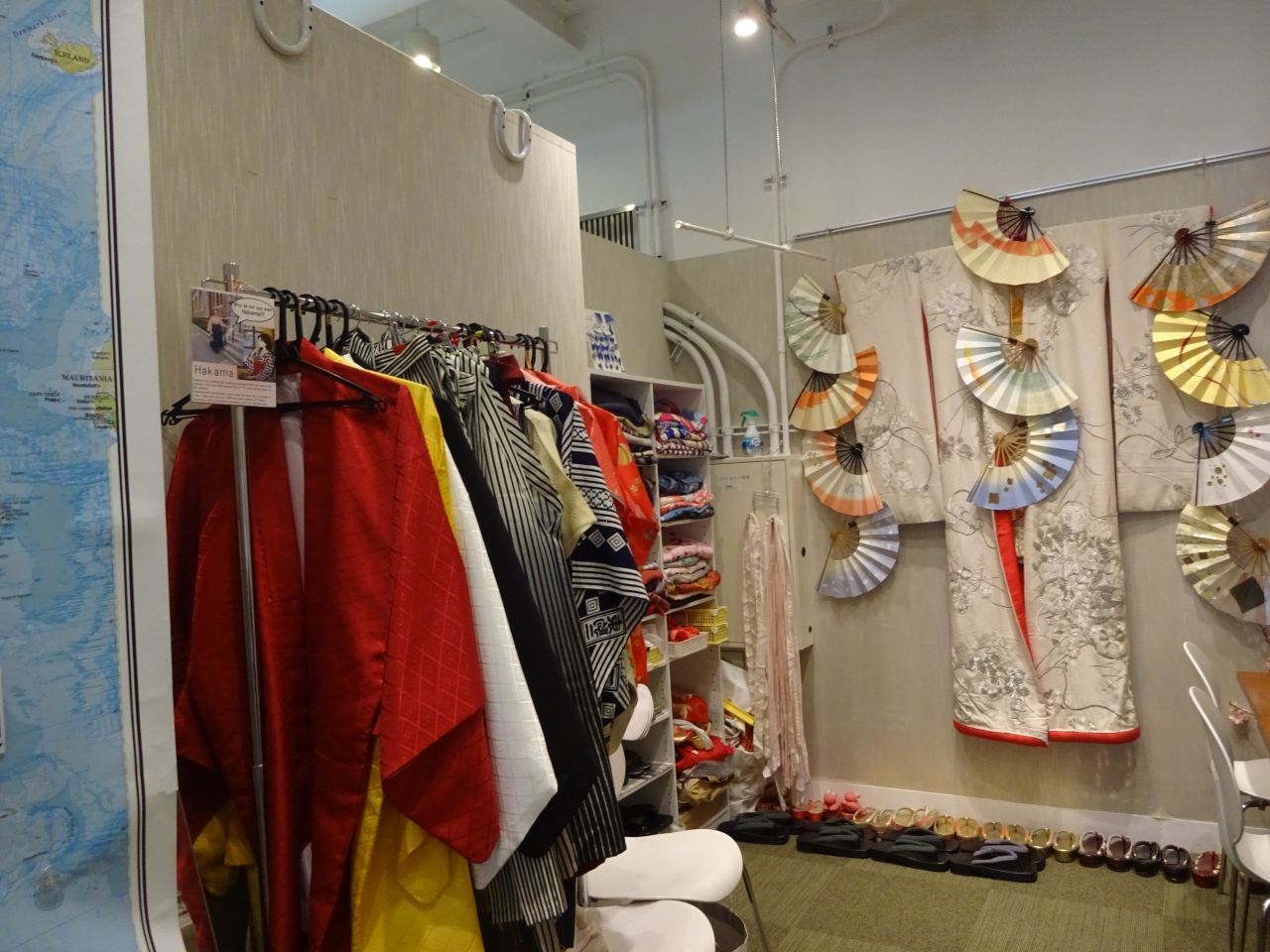 パンフレットも各国のものがあり、また日本土産になるような品や扇子のデスプレイ、着物などもあり外国人の方には嬉しい場所でしょう。