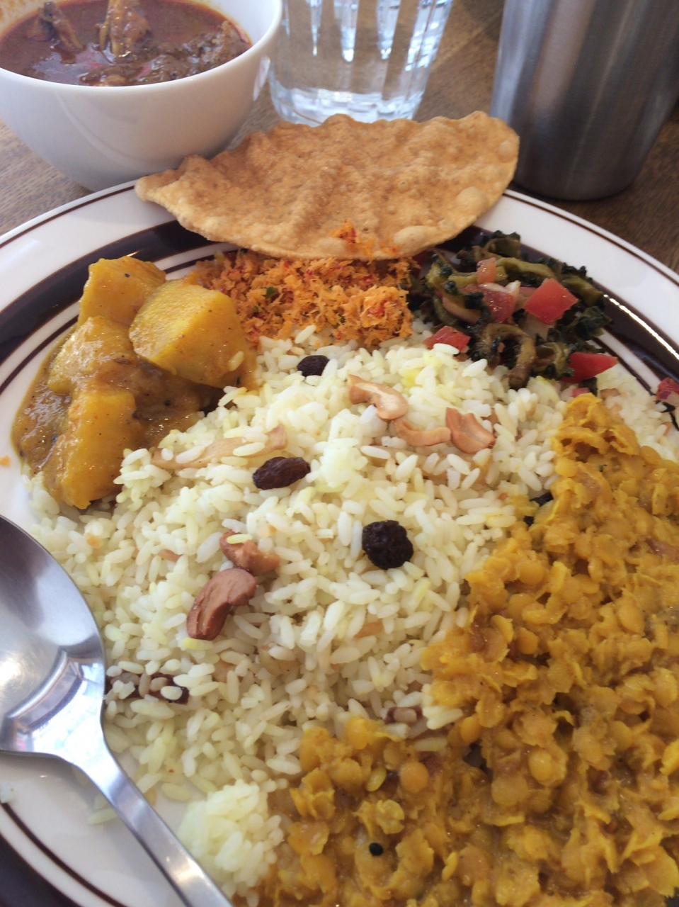 初めて食べるスリランカカレーは、とっても美味しく大満足でした☆ライスの他にゴーヤの漬物のようなものと、さつまいもや豆のせんべいなどなど、色々乗っていて、まぜまぜして食べて下さいとのことでした。