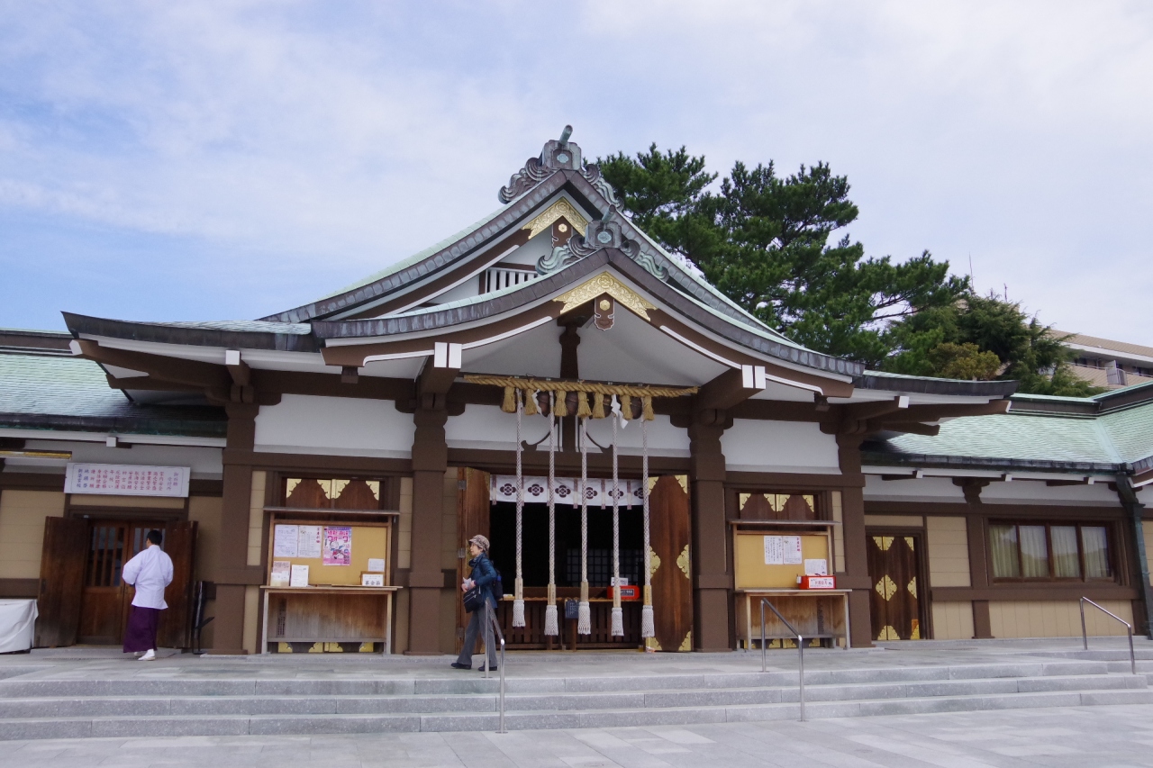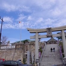 御影石の鳥居としては日本最大の鳥居をくぐって階段を上ると、とってもきれいな拝殿が建っています。