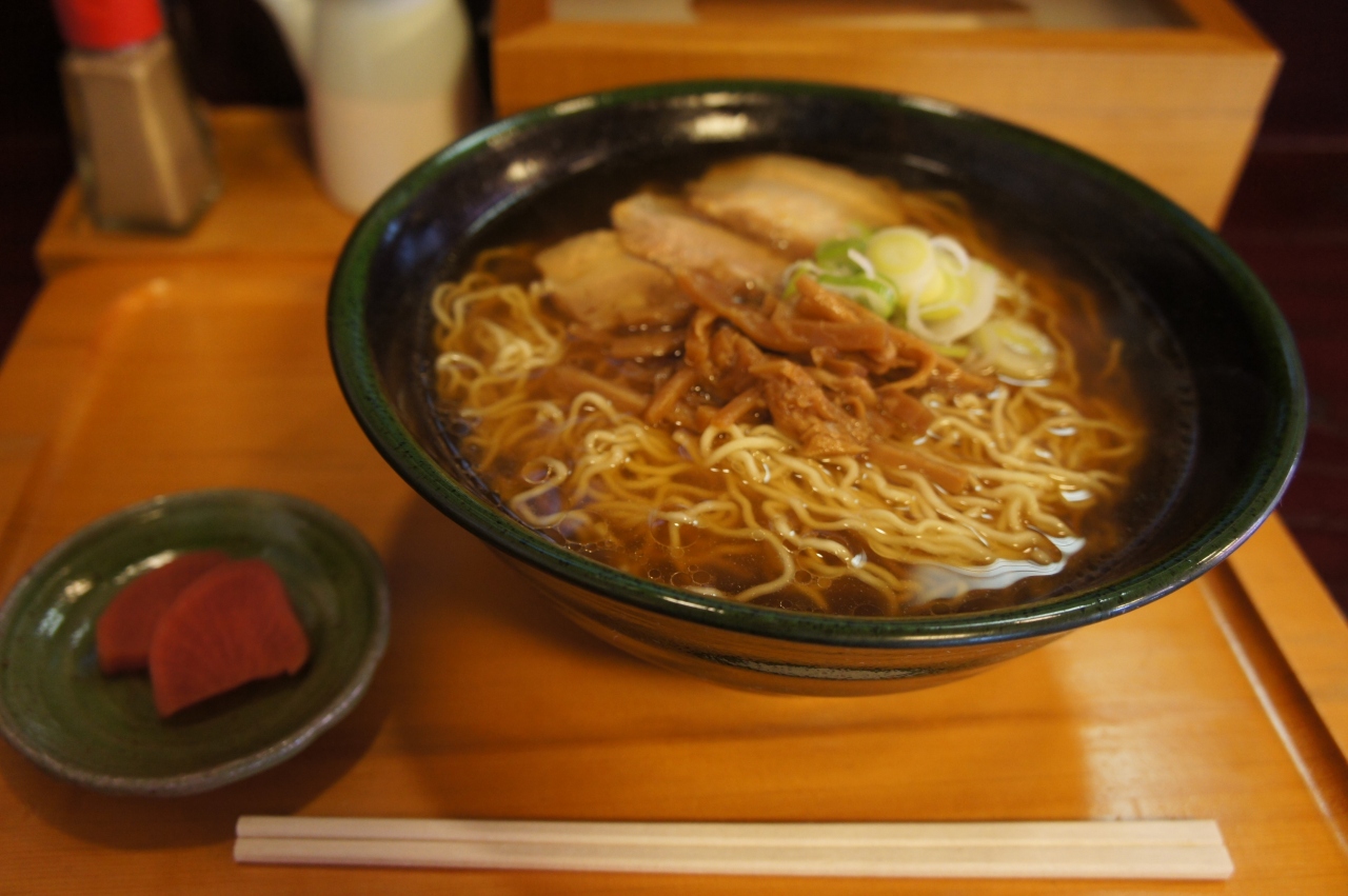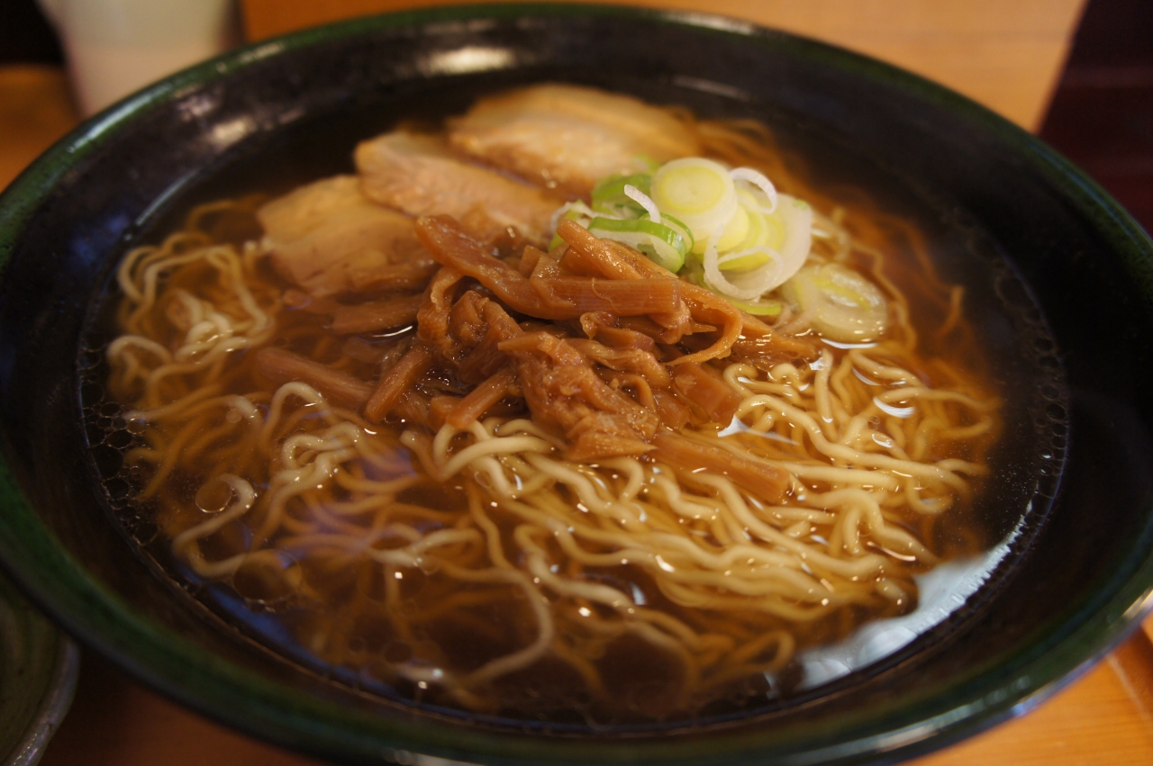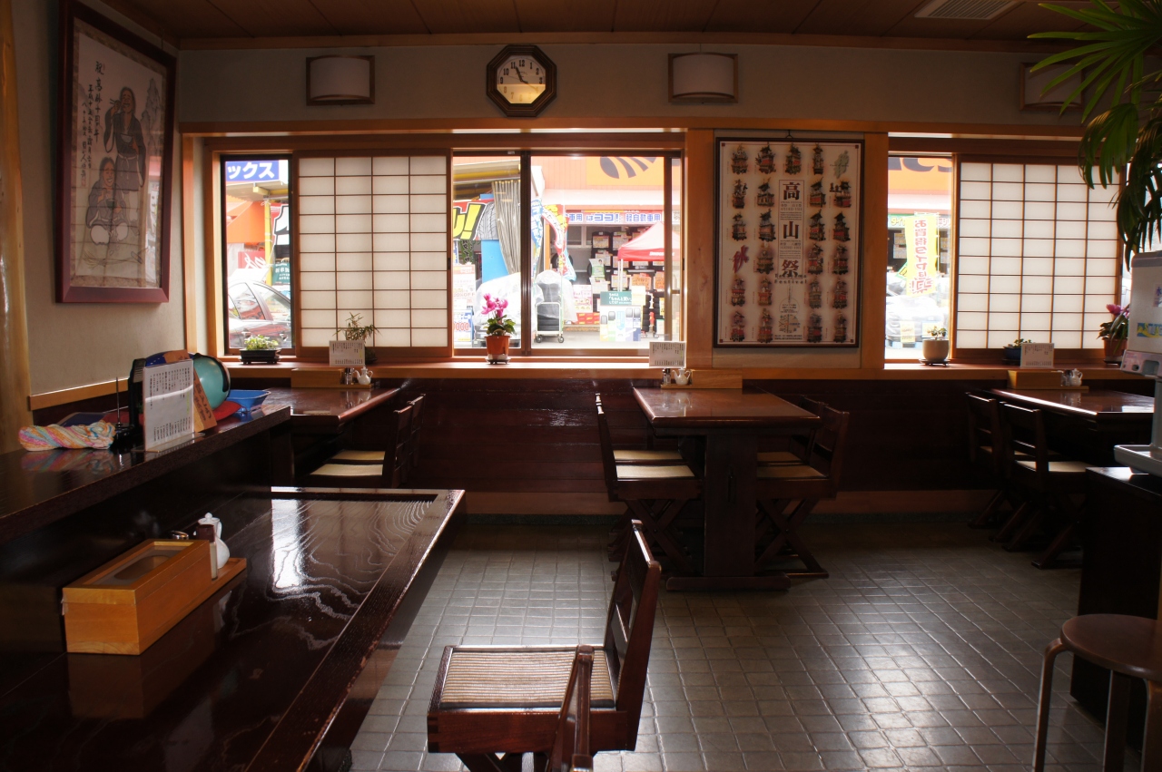 国道41号線沿い、高山市の南入口にあります。高山市の中心部からはかなり外れて外れていますので、車利用が便利。無料駐車場も完備しています。和風建築の店で飛騨地方独特の造りとなっています。カウンターの上にはプロボクサーや著名人の記念写真や色紙が飾られています。結構、中華そばの味を知り尽くした人たちが足繁く通っている店のようです。メニューは掲示板のみ、メニューが少ないためかテーブルの上に置かれる品書きはありません。迷わず、中華そばを注文。中細麺に乗っかっている具はチャーシューが3枚、メンマ、きざみネギだけです。いたってシンプルなのが飛騨の中華そばの特徴です。鰹だしをベースにしていくつかの出汁の材料をブレンドした醤油味のスープ。結構奥深い味がしました。初めて飛騨の中華そばを食べたらやみつきになりそうな感じがします。