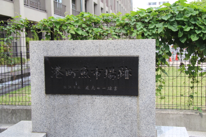 JR関内駅から横浜公園に向かう際、関内駅前でたまたま石碑を見つけました。近寄って見ると港町魚市場跡の石碑でした。昭和6年開設の中央卸売市場(神奈川区)へ移転するまでこの地に市場があったようです。 今は横浜市役所になっていて隔世の感があります。