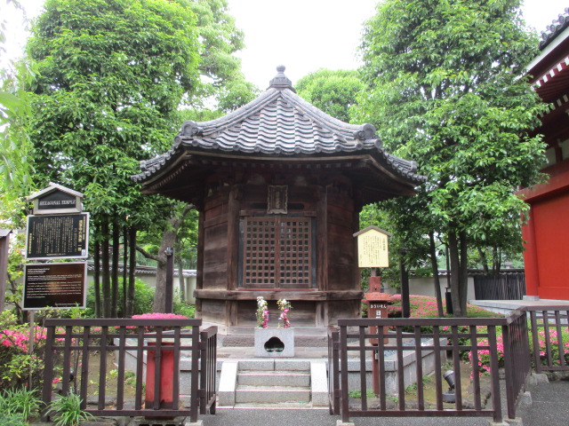 地下鉄浅草駅から雷門(風雷神門)をくぐって仲見世通りを進んで宝蔵門、浅草寺本堂を左に行くと影向堂の前の斜めの通りの先に六角堂があります。歩いて7分ぐらいで着きます。六角堂は1618年建立、浅草寺内に現存する最も古い建造物だそうです。ひっそりとした静かな場所に木材の色艶がそのままの小さなお堂でとても魅力的です。見事に均整の取れた江戸建築物をじっくり眺めることをお奨めします。