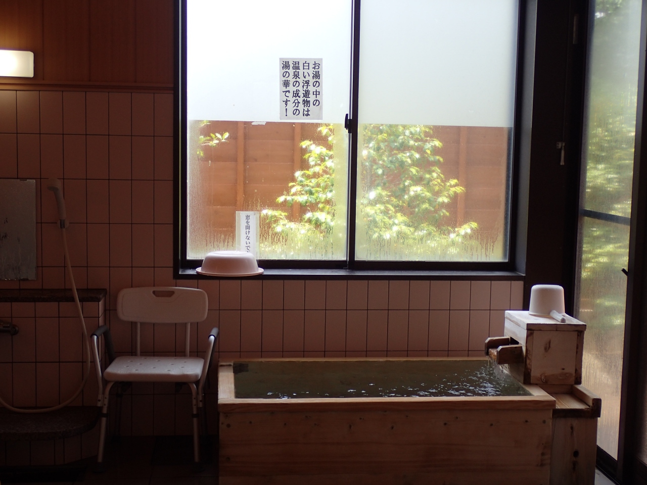 泉質は単純硫黄泉、湯口に顔を近づけるとふんわりと硫化水素臭がして、お湯の中には白い湯の華が無数に舞い、浴感は泉質どおりつるトロ、と申し分なく、嬉しい湯浴みだった。
