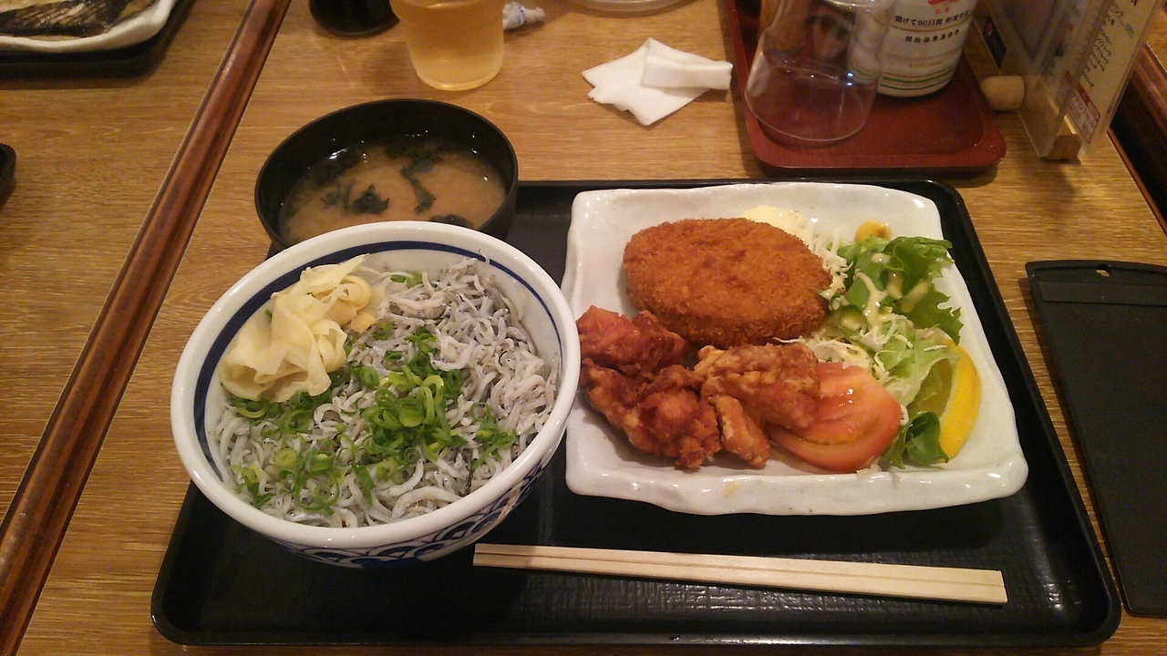 ランチで、しらす丼とメンチカツ・鳥の唐揚げセットをいただきました。