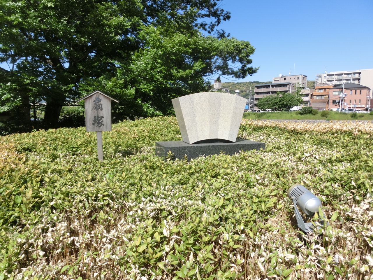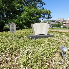 五条大橋の西詰め、北側の緑地の中に埋もれるように、扇型をした御影石の記念碑がある。