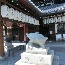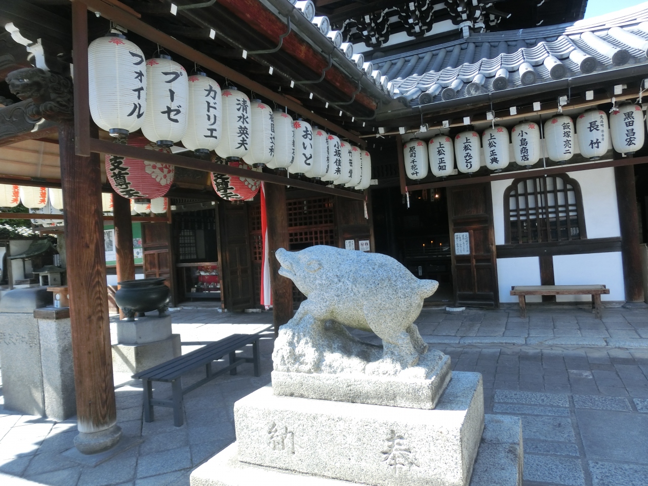 建仁寺の脇道を歩いていたら狛犬ならぬ高麗イノシシに護られたお堂があった。