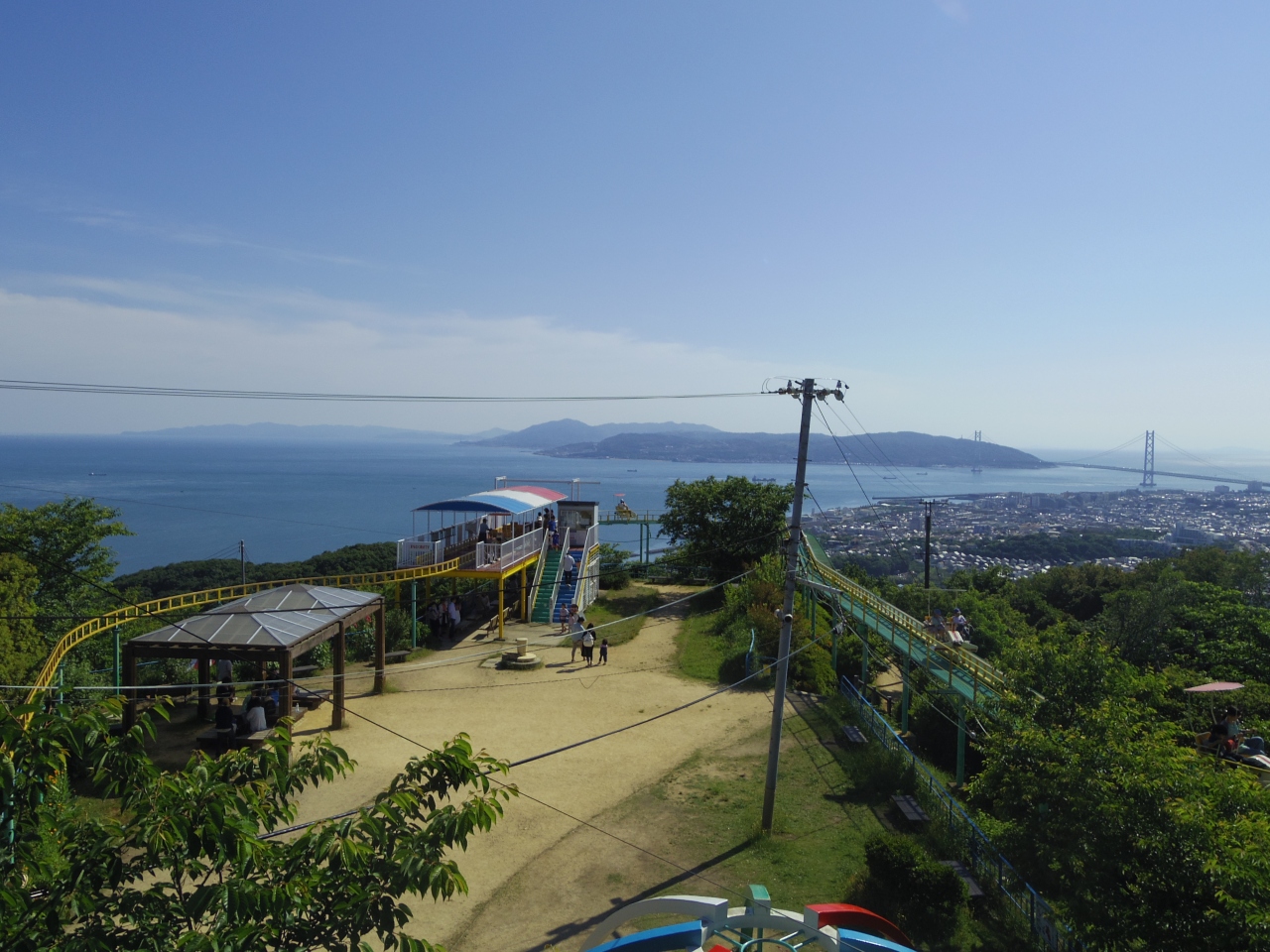 ロープウェイ、カレーター、リフトと乗り継いで着いた広場には足漕ぎの自転車型の遊覧具とかもあって、有料ですが色々乗れるので子供は楽しいのではないでしょうか。回転展望台なんかもあり、中はゲームセンターや喫茶店になっていました。