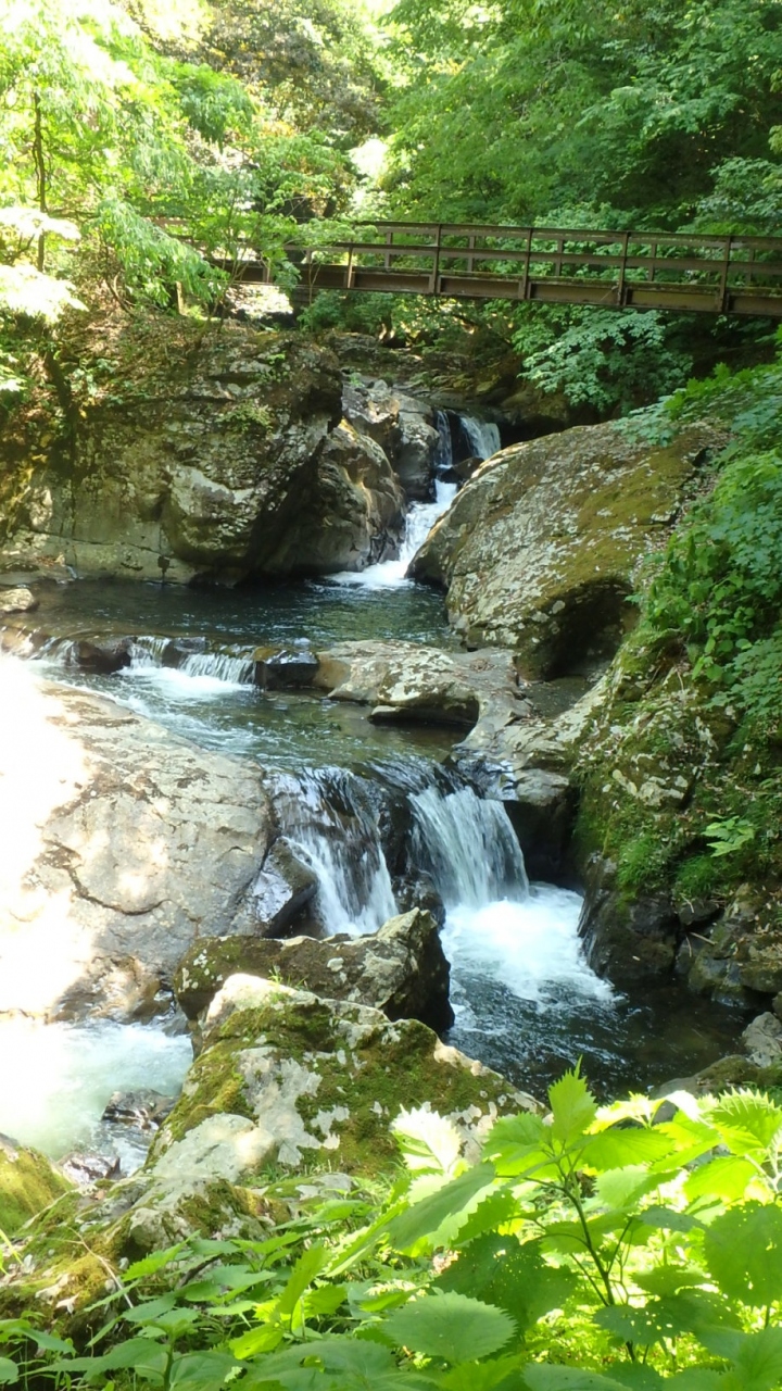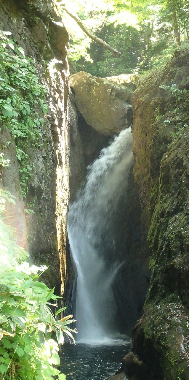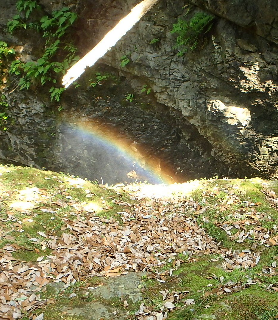 このうち、滝尻滝は岩の割れ目を流れ落ちており、上に虹がかかっていました。滝本体は、下流側の橋から右岸沿いに細い道があり、間近に見ることができます。