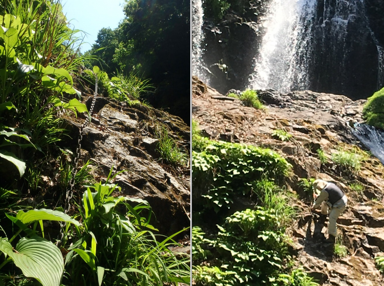 最上流の八汐滝は、左岸から眺められますが、飛び石を渡って右岸に達し、鎖につかまって岩をよじ登ると、滝壺を間近に眺められます。また、八塩滝の左岸側には登り道があって、木々の間から辛うじて滝の全容を眺めることができます。