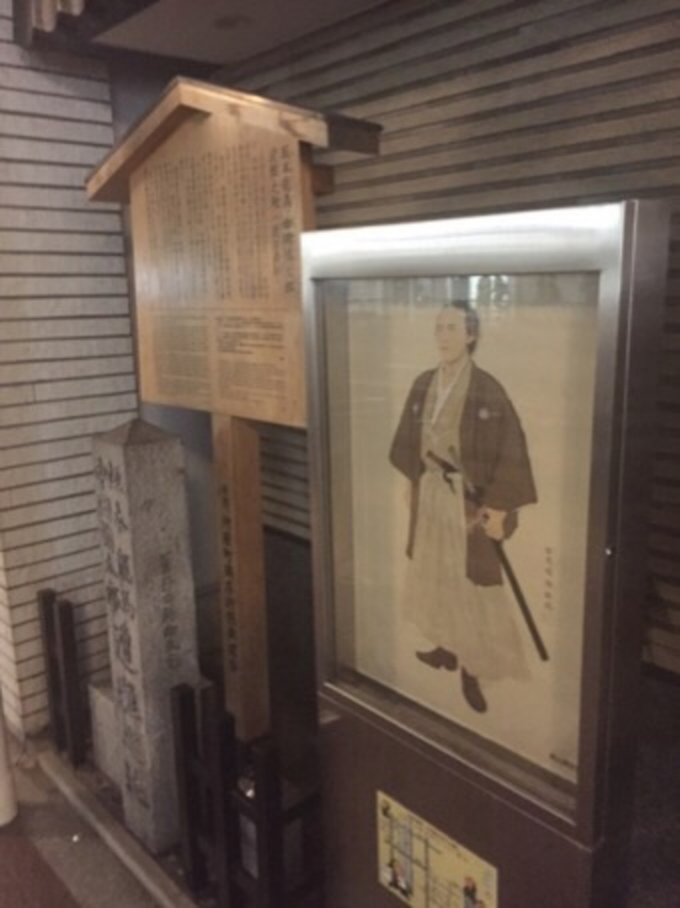 坂本龍馬と中岡慎太郎が刺客に暗殺された醤油屋の近江屋がこの辺りにあったため、この碑が置かれていますが、京都一の繁華街で、しかもコンビニの前にあるため、若干味気ない碑ではあります。ちなみに遭難とは命にかかわるような災難にあうことで、暗殺も遭難になるようです…