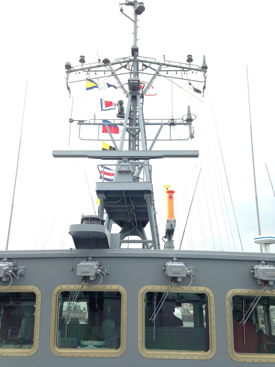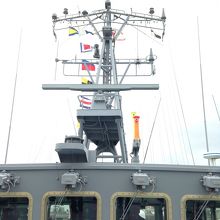 魚雷などを取り除く掃海艇を見学しました。掃海艇は魚雷に反応しないように木造です塗装がきれいで遠目で見ると鉄の船にしか見えません。操縦する人たちの椅子はとても小さくきつくて大変そうでした。旗の意味を教えてもらえました自衛隊だけでなく万国共通だそうです、でも漁船はスペース上積んでないらしいです。