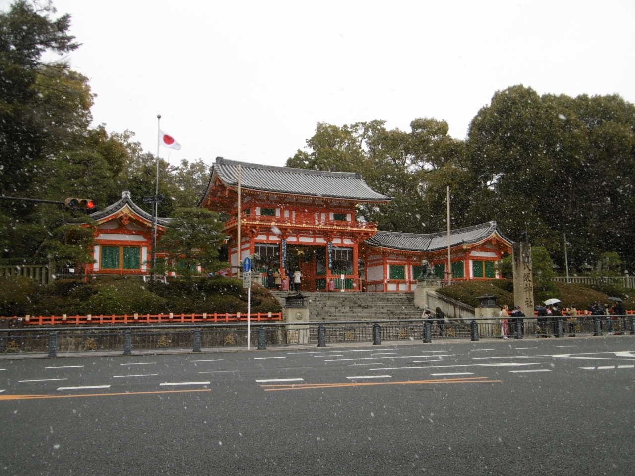 嫌な思いをしながら『八坂神社』へ行ってみると、雪舞う『西楼門』の素敵な景色に出会えました!