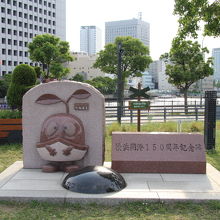 記念碑の背後にワイルドフラワー&トピアリーが展示してあったのでそれを見に行った際見つけたのでそれがなければなかなか分かりにくいところに設置されていると思われます。横浜博のマスコットキャラクターの「たねまる」はユーモラスで良いと思います。