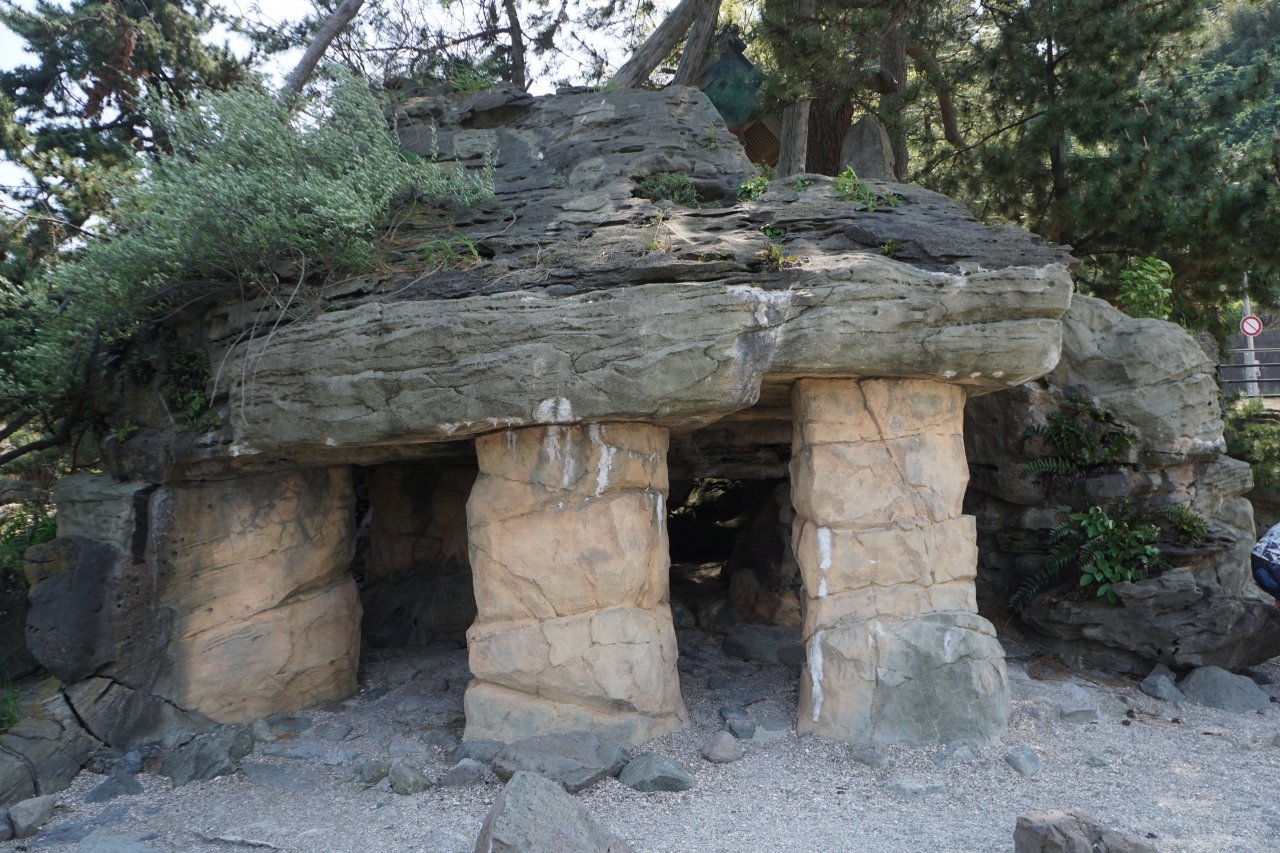 義経岩の辺りは雨晴海岸の一番のビューポイント。ポスターなんかで使われている景色はこの辺りから見たものだと思います。国道沿いの線路を越えて、すぐの岩場なんですが、義経一行が奥州へ落ち延びる途中、にわか雨の晴れるのを待ったという岩で、これが雨晴の名前の由来ともなったということ。岩の下部は本当に雨が降ったら雨宿りできるような形になっています。