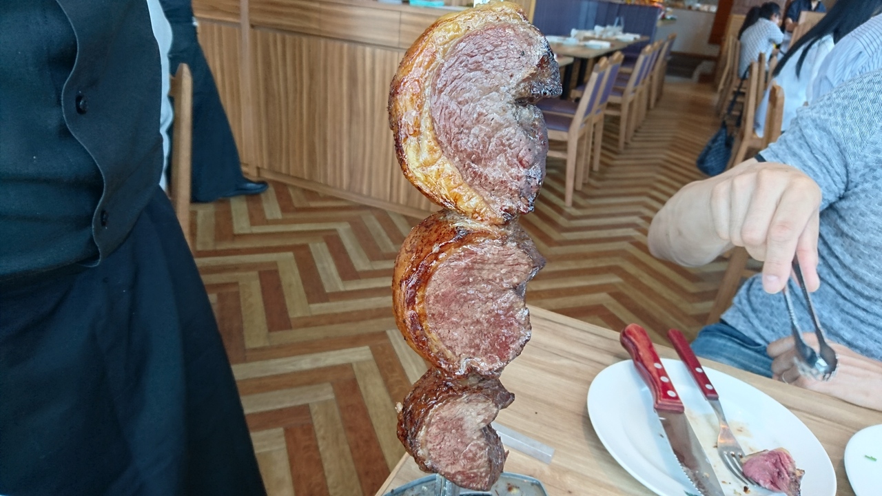 スタッフの方がブラジルっぽい高めのテンションでビーフ、鶏肉、ソーセージ等を切り分けにきてくれます。