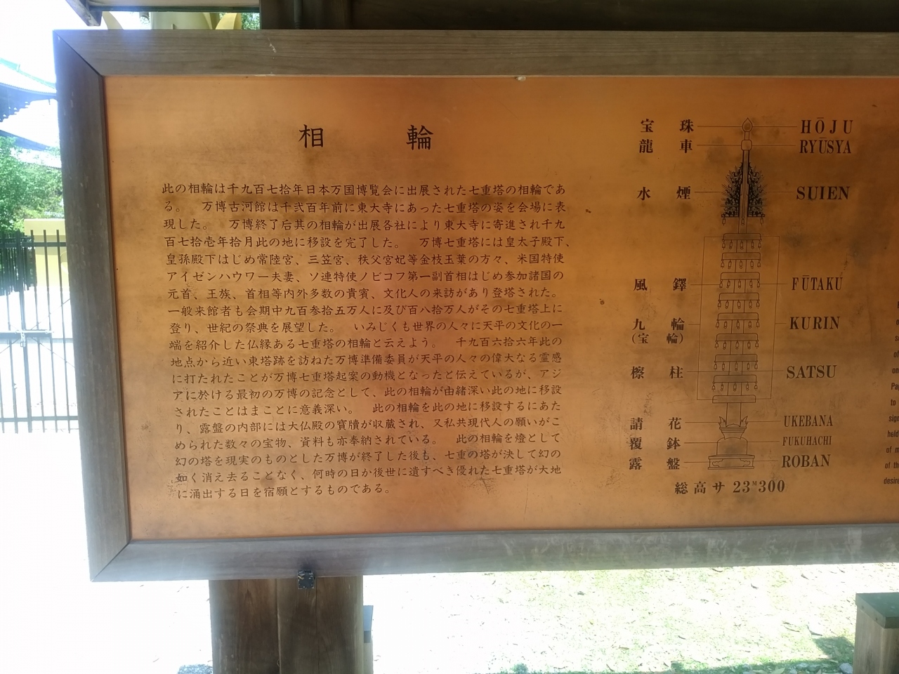法華堂観光の後に鐘楼近くの道を下って歩いて降りると金色に輝いた塔がありました。展示されている相輪は1970年の日本万博に出展された七重塔の相輪だそうです。この塔の最下部にある露盤には大仏殿の宝物や資料が奉納されていると掲示板に書いて有ります。結構巨大で金ピカで綺麗でした。