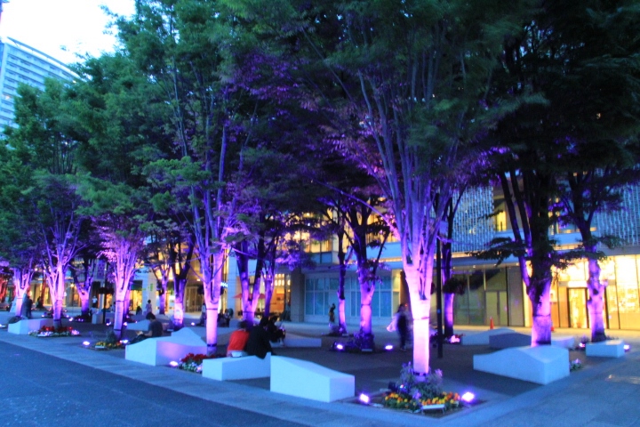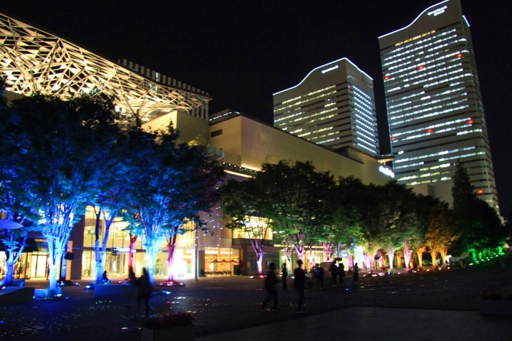 グランモール公園は第33回全国都市緑化よこはまフェアのメイン会場のひとつになっています。細長いグランモール公園では、人が近づくと光の色を変え、音を奏で、次々にまわりの木々に光と音を伝播していく全長210mの「呼応する木々」が魅力的です。