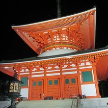 高野山で最も早く建てられた朱色の塔です。昭和に入り再建されたものですが、高さ48.5m、高野山で最も大きい多宝塔です。塔の中には、本尊の大日如来を四仏の如来像が囲むように安置され、更にその外の16柱に菩薩像が描かれています。全体として曼荼羅の世界を表現しているということですが、私のような凡人には理解不能でした。ただ見る角度によって異なる景色、金色に輝く本尊と赤い柱、極採色の菩薩像には目を奪われました。ライトアップされた夜の大塔も朱色が艶やかに浮き上がり大変美しかったです。