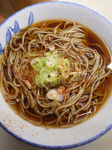 蕎麦に、ダシをたっぷりかけ、ネギをトッピングしてある。
