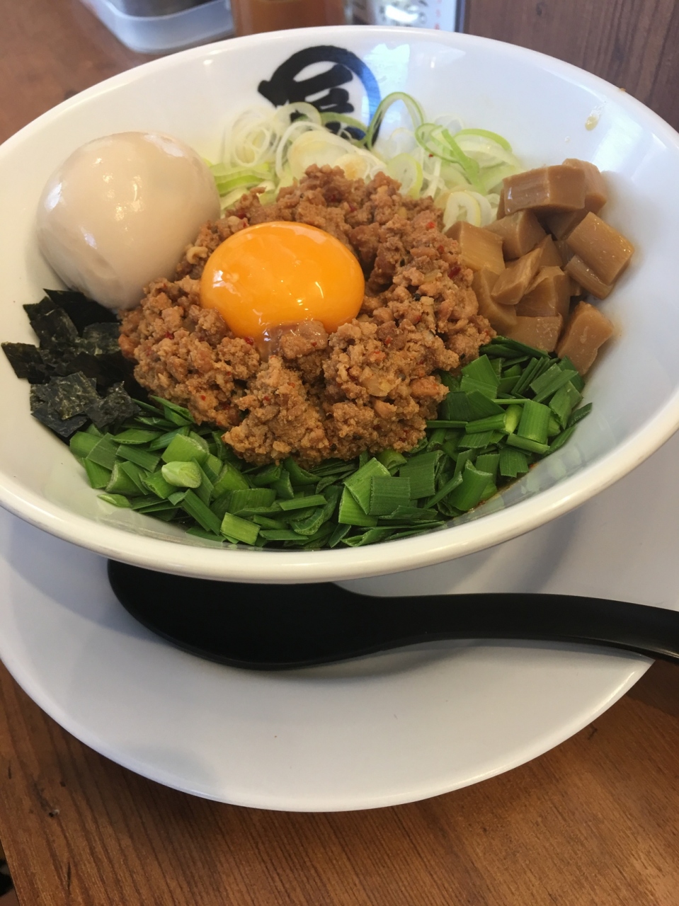 台湾まぜそばは太麺、肉味噌はあっさり目ですがボリューミィです。締めの一口ご飯付き。