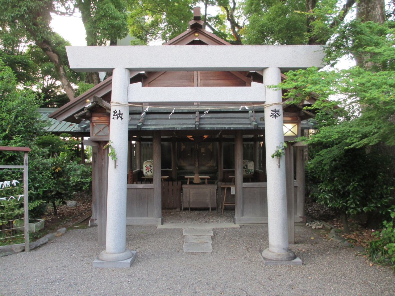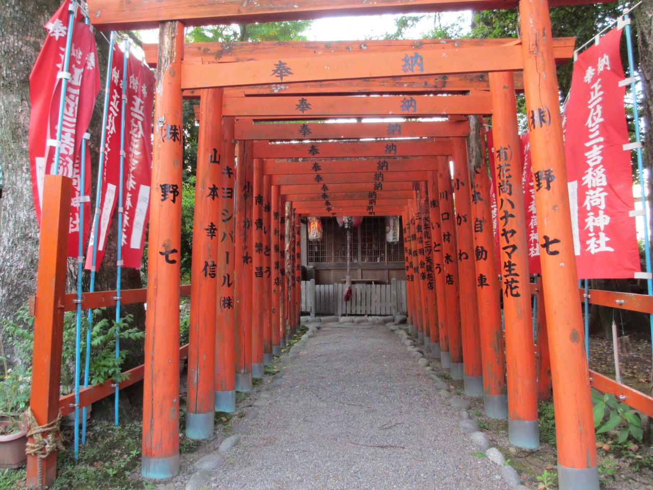 伊勢市駅前広場のすぐそばにあります。大きな提灯が掲げられている木造の拝殿は古く木々に囲まれひっそりとした雰囲気の神社です。朱色の奉納された鳥居が並ぶ三吉稲荷大明神を祀る正一三吉稲荷神社が境内にあります。外宮参道からの抜け道として歩く人がいます。宿泊した日の出旅館の前にあり日中と夜に訪れました。夜は照明が少なく提灯の明かりが厳かな雰囲気でした。