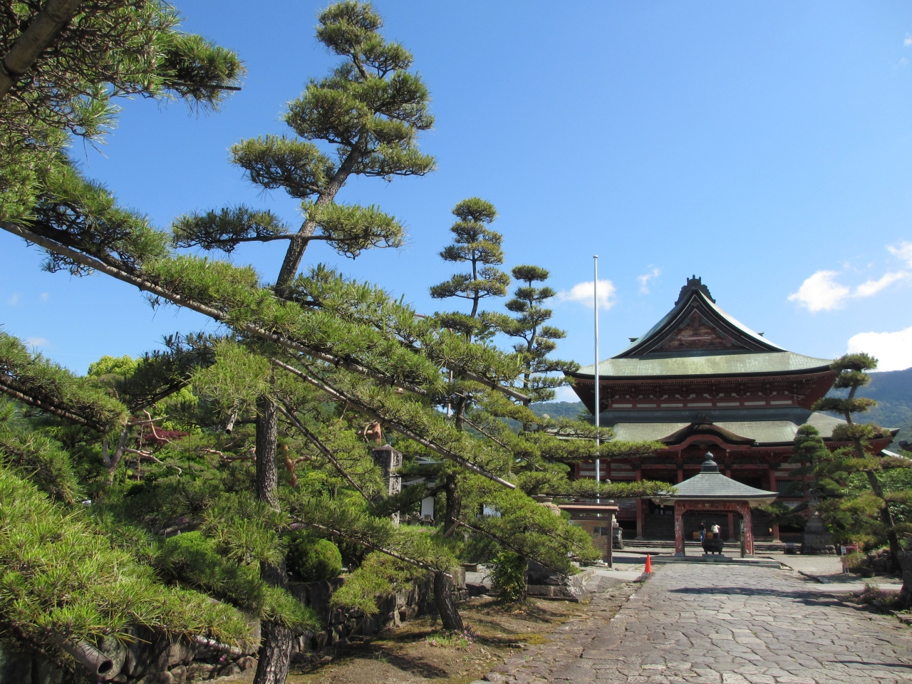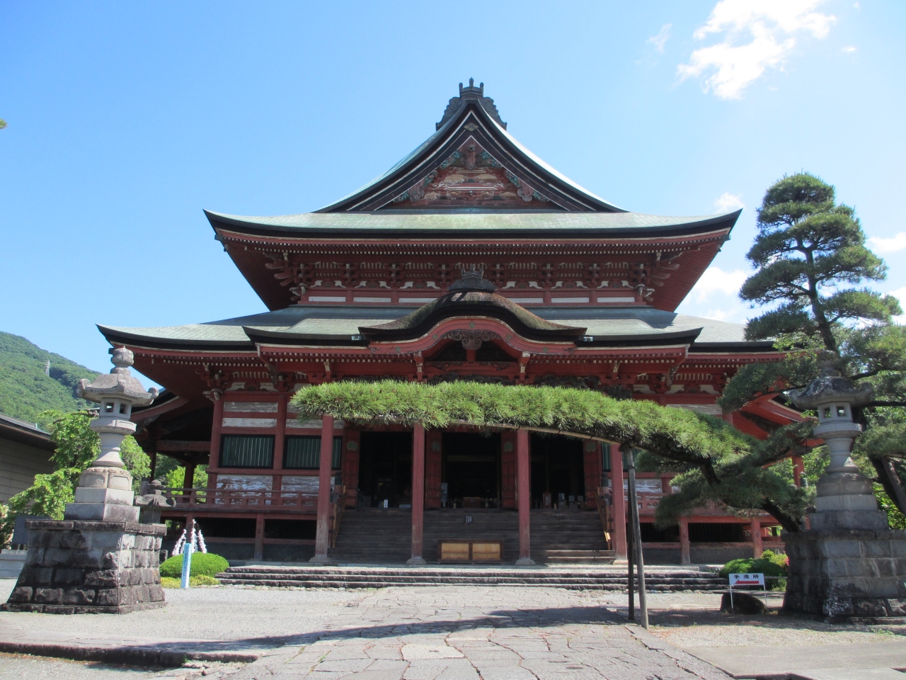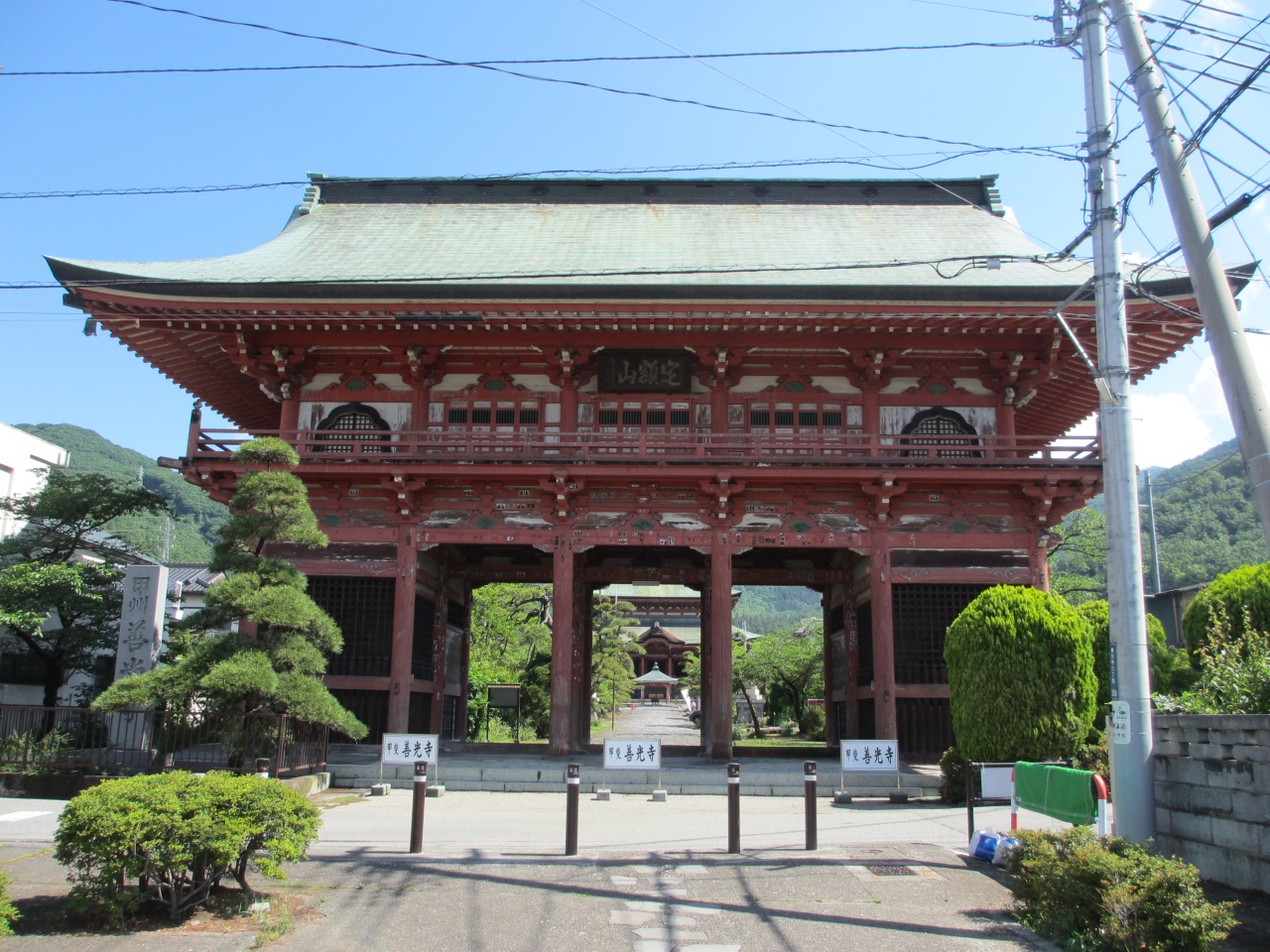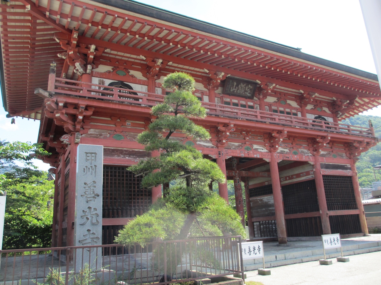 東京から諏訪に向かう途中立ち寄りました。甲府昭和インターから20分ほどのところに建っています。木造の山門、参道沿いに植えられた松、千社札が貼られた朱色の仁王門などの見どころがあります。武田信玄が、長野の善光寺にあった本尊や宝物を移したことから歴史が始まっています。その後本尊は移転を繰り返し、1598年に現在の地に戻ってきました。本尊が祀られている金堂の天井に描かれた二頭の鳴き龍は、気持ちよい響きがします。金堂下には戒壇廻りも作られています。近くには武田神社や山梨県護国神社もあり、併せて参拝することをおすすめします。