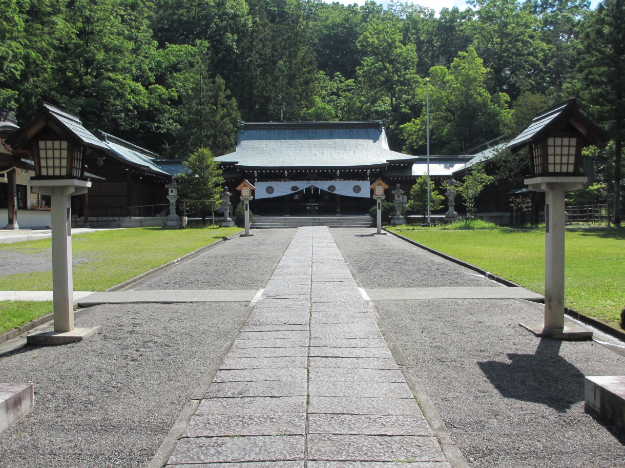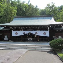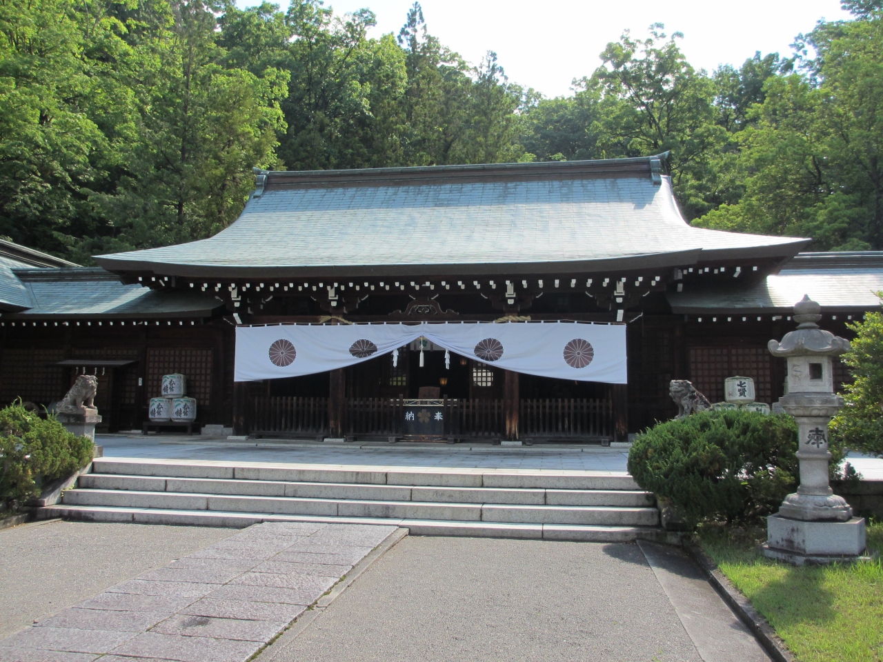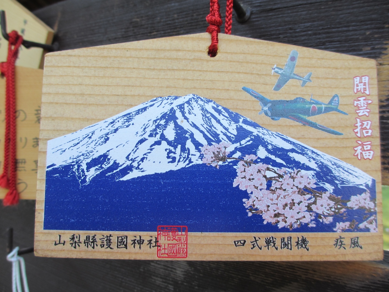 武田神社から車で数分のところに建つ神社です。山を背景にした緑に囲まれた敷地に、甲府市街を眺めるように、立派な社殿が建っています。戦争で亡くなった25000人の山梨県出身者が祀られています。参道奥の木立には大小合わせて15ほどの慰霊碑が立っています。社務所で売られている絵馬は、富士山と四式戦闘機が描かれたものと丸い顔をした犬が描かれたもの、2種類あります。絵馬に戦闘機が描かれているのは珍しいかと思います。社殿は小鳥がさえずる静かな落ち着いた環境の中に建っています。亡くなった方たちは安らかに眠っているのではないかと感じました。