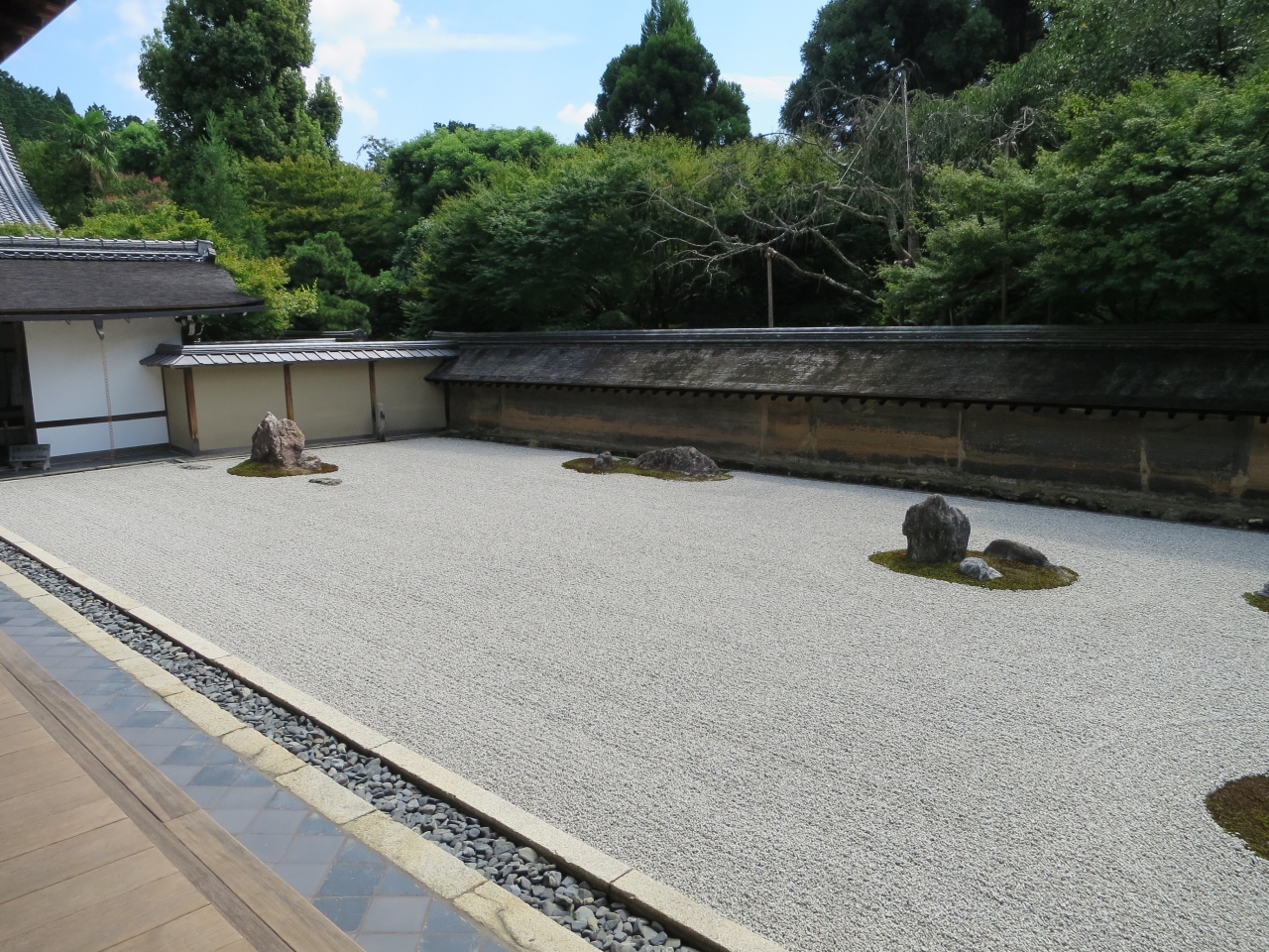 龍安寺の石庭と言えば、徹底的に抽象化された日本庭園の典型と言ってもいい存在なのだと思います。私には、この白砂や石の配置が何を意味するのか見当もつきませんが、それでも、この不思議な雰囲気を他の観光客と一体になって眺めるのは得難い経験でした。