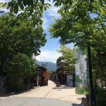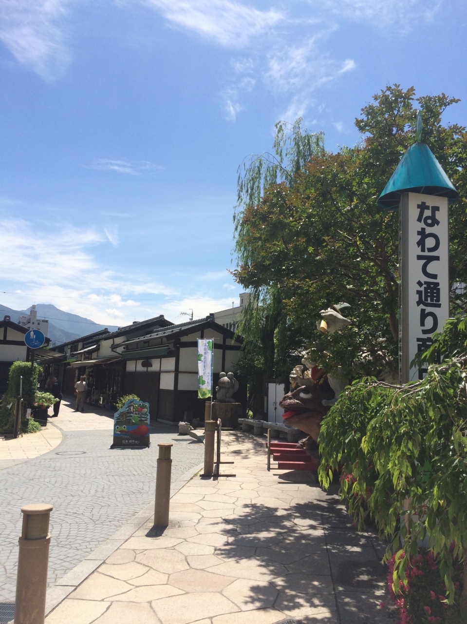 女鳥羽川沿いにある雑貨や、食べ物屋街灯並ぶブラブラ歩くには良い雰囲気の通りです。松本駅から千歳橋を右に曲がると大きなカエルの像が迎えてくれ至る所にカエルに関係したものがありました。通り沿いには四柱神社もあり観光化された通りです。