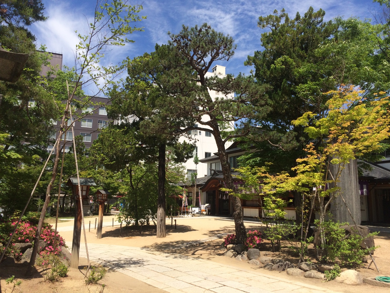 松本駅から千歳橋を渡ると右側にあり鳥居が大きく鳥居付近は大きな広場になっていました。僅かばかりの土産屋があります。川沿いになわて通りが、雑貨や食べ物屋がある方から境内に入った方が雰囲気が良かったです。ゆったりとした境内で縁結びの神社でもあるようです。裏にも出入口があり駐車場があります。