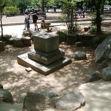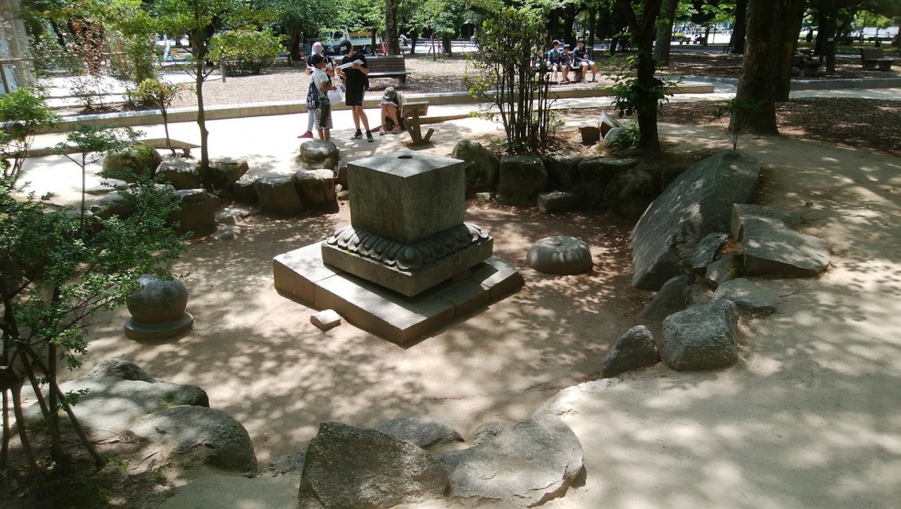 1年ぶりに訪れた平和記念公園を散策しているときに、立ち寄りました。広い公園内の北西エリアの一画にあって、目立つスポットではないので、気を付けて歩かないと通り過ごしてしまいます。当時爆心地に近い場所にあった慈仙寺の墓所の中にあった、広島藩浅野家御年寄岡本宮内の墓です。原爆の爆風で吹き飛ばされた墓がたくさんあり、猛烈な原爆のパワーをまざまざと受けた墓石です。この墓はここで大事に管理され、それ以外の墓は別の場所に移転した慈仙寺の墓所に移されました。墓の地面が少し低いのは、公園自体が少し盛土してつくられたためで、この墓の地面が元のこの周辺の地面の高さです。
