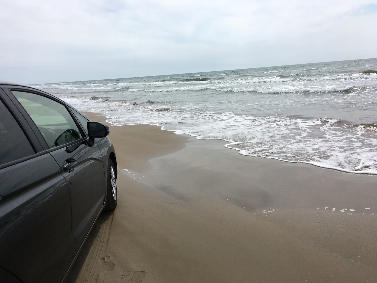 恐々、海の波打ち際に 車で入っていきました。砂の粒子が他より細かく、海水を含み硬くなったから、車でも走れるそうです。いざ走りだすと、スピードも出て あっという間の8キロでした。かき焼きの小屋や海鮮のお店も出ていました。