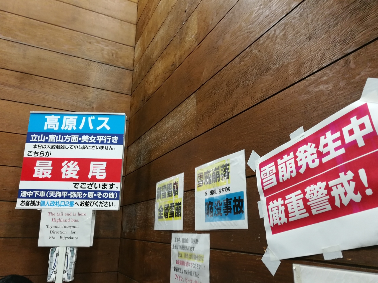 大勢だったが、人はうまく並んだ。最後尾の板できちんと見えた。日本語と英語がはっきりと表示されていた。5月の忙しい休日に、1時間ごろも待たないではいけない。途中で美女平の駅に泊まらなくて、直接立山駅に泊まった。
