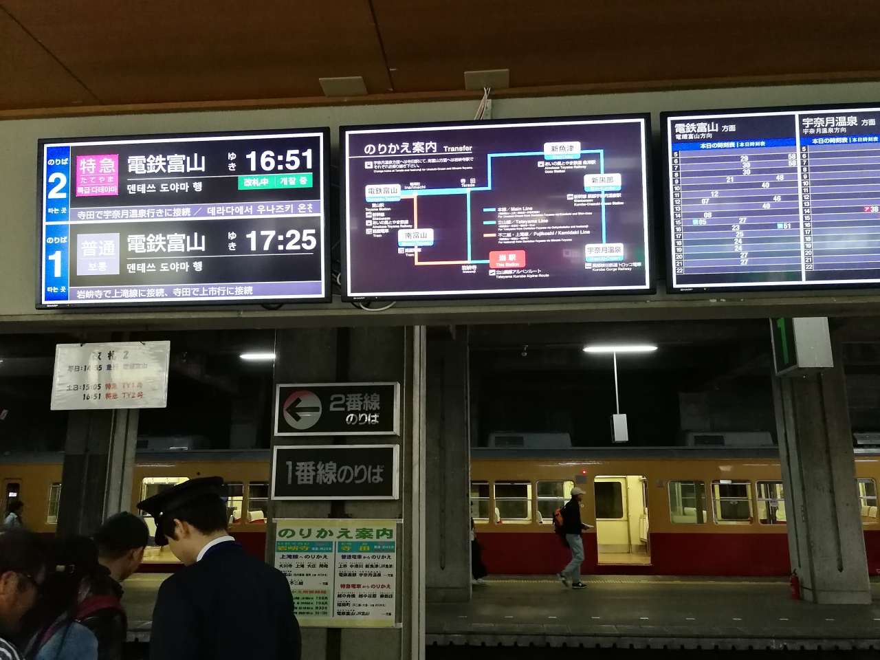立山駅から富山駅まで特急の列車で乗って、少し疲れたが、素晴らしい外の風景を目を引かれた。特に立山駅の近くの狭い線路と流れる川です。1時間に約2つの列車があります。立山駅は低いと赤い建築物で、自然の木と山と共にです。