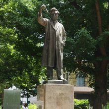 上野公園を散策途中に見つけました。国立博物館に向かって右手側にある木立の散策路のなかにひっそりとあって、風景に溶け込んでいてあまり目立ちません。日本の大偉人なのに・・・。最近はお札の顔のイメージが強いため、銅像の顔はちょっとイメージが違って見えました。