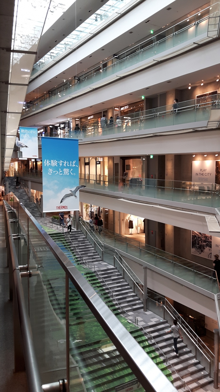 表参道ヒルズの吹き抜けエリアは、クリスマスの際のデコレーションが人気ですが、それ以外の時期もアートなディスプレイが楽しい空間です。階段の下から見上げると一枚の絵になっていました。通路沿いにブティックが並び、広場や座るスペースはほとんど無いので、中でぶらぶらウインドウショッピングというより、お目当ての店に行くというスタイルです。